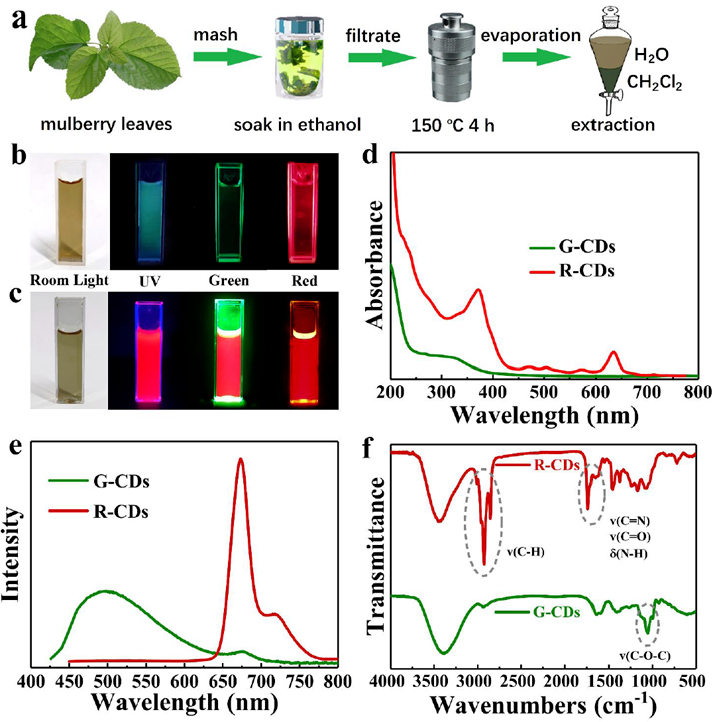 近日,復(fù)旦大學(xué)報道了一種以桑葉為原料制備的碳點(CDs),其具有較強的近紅外熒光,絕對量子產(chǎn)率(QY)為73%,半峰全寬(FWHM)為20 nm,是迄今為止所知的最亮的深紅色發(fā)射碳點(R-CDs),而且具有良好的生物相容性和熒光穩(wěn)定性。