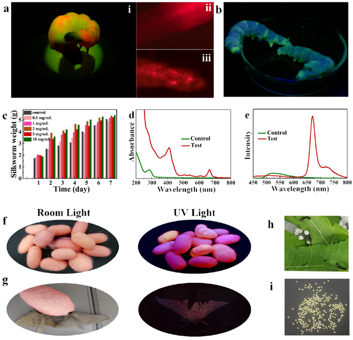 用這種CDs喂養(yǎng)后,蠶會發(fā)出鮮紅色的熒光,而且能夠健康生長,正常結(jié)繭,蠶繭在日光下呈粉紅色,在紫外線下呈亮紅色熒光。通過對試驗蠶和蠶繭的解剖分析可獲得CDs的代謝途徑,即熒光CDs被蠶從消化道吸收,然后轉(zhuǎn)移到絲腺,最后進入蠶繭,未被吸收的CDs隨糞便排出體外。