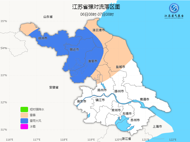 據(jù)江蘇省氣象臺最新氣象資料分析,預計4月6日午后到夜里,我省徐州、宿遷、淮安、連云港及鹽城北部有8~10級雷雨大風等強對流性天氣,徐州、宿遷局部地區(qū)可能有小冰雹。