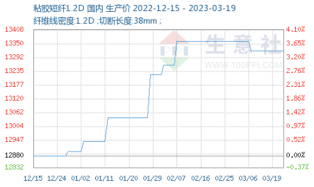 據(jù)生意社價格監(jiān)測顯示,截止3月19日,1.2D*38mm粘膠短纖國內(nèi)地區(qū)出廠報價為13320元/噸,與前期價格持平。