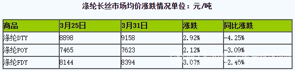 根據(jù)生意社監(jiān)測(cè)顯示,上周(3月25-31日)維持小幅上行,其中,滌綸FDY上漲3.07%,POY上漲2.12%,滌綸DTY上漲2.92%。目前,江浙地區(qū)主流滌綸長(zhǎng)絲工廠,滌綸POY(150D/48F)報(bào)價(jià)在7550-7750元/噸,滌綸DTY(150D/48F低彈)報(bào)價(jià)在8900-9500元/噸,滌綸FDY(150D/96F)報(bào)價(jià)在8300-8500元/噸。