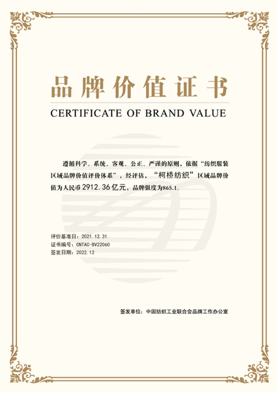 中國紡織工業(yè)聯(lián)合會品牌工作辦公室聯(lián)合有關專業(yè)機構,以《區(qū)域品牌價值評價 產業(yè)聚集區(qū)》(GB/T39905-2021)等相關國家標準、國際標準為基礎技術依據(jù),確立紡織服裝區(qū)域品牌價值評價模型,經(jīng)過基礎數(shù)據(jù)準備、深入調研、方法確定、工作組評價、專家組評審等流程,就“柯橋紡織”、“青山湖針紡”、“震澤蠶絲”等區(qū)域品牌開展了價值評價。經(jīng)評估,“柯橋紡織”區(qū)域品牌價值為2912.36億元,中國紡織行業(yè)首個價值千億級區(qū)域品牌誕生。