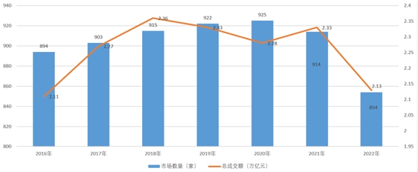圖表1 2016-2022年紡織服裝專業(yè)市場(chǎng)數(shù)量與成交額