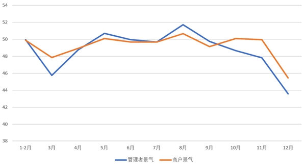 景氣方面。2022年,紡織服裝專業(yè)市場(chǎng)管理者景氣與商戶景氣走勢(shì)基本一致。從景氣走勢(shì)看,專業(yè)市場(chǎng)全年景氣整體低迷,分別在上半年春裝銷售旺季和下半年夏裝旺季達(dá)到50榮枯線以上;四季度受疫情影響,景氣指數(shù)出現(xiàn)大幅下滑。從全年數(shù)值看,2022年專業(yè)市場(chǎng)管理者景氣指數(shù)全年平均值為48.75,商戶景氣指數(shù)全年平均值為49.21,兩項(xiàng)平均數(shù)均低于50榮枯線,相較2021年有明顯下滑,管理者景氣略低于商戶景氣。