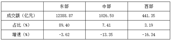圖表5 東中西部地區(qū)市場(chǎng)成交額占比、增速表