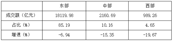從區(qū)域看,854家專業(yè)市場(chǎng)中,東部地區(qū)515家,成交額18119.98億元,占總成交額的85.19%,同比下降6.94%。中部地區(qū)187家市場(chǎng)成交額2160.69億元,占總成交額的10.16%,同比下降15.35%,西部地區(qū)152家市場(chǎng)成交額989.26億元,占總成交額的4.65%,同比下降19.67%。