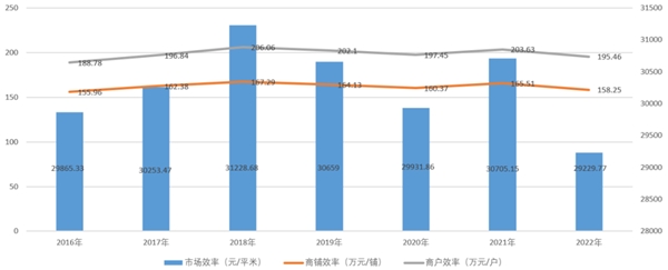 運(yùn)行效率方面。2022年紡織服裝專業(yè)市場(chǎng)商鋪效率為158.25萬元/鋪,同比下降4.39%;商戶效率為195.46萬元/戶,同比下降4.01%;市場(chǎng)效率為29229.77元/平米,同比下降4.80%。