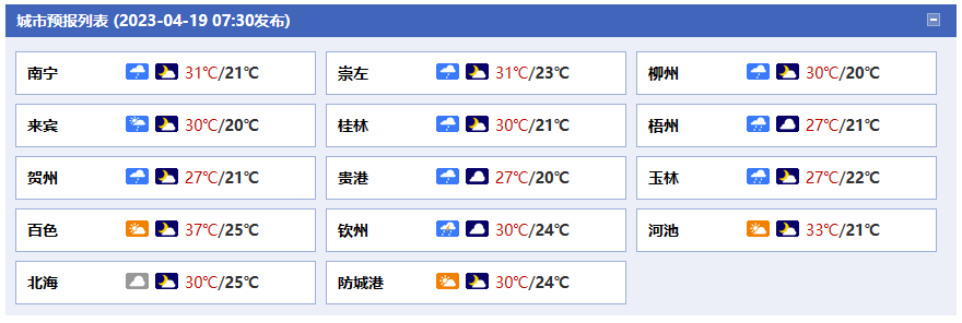 南寧市:今天白天小雨、局地中雨,偏北風3級、局地陣風5~6級,今天晚上多云,偏東風1~2級,最高溫度31℃,最低溫度21℃。