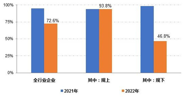 跟蹤數(shù)據(jù)顯示,52家重點產(chǎn)業(yè)集群內(nèi)共4.2萬戶紡織企業(yè),其中8%為規(guī)模以上企業(yè),從構成來看中小微紡織企業(yè)占據(jù)絕大多數(shù)。2022年,集群內(nèi)開工企業(yè)數(shù)占比為98.1%,較2021年微增0.3個百分點。但受國內(nèi)疫情反復、國內(nèi)外市場需求不足、庫存壓力抬升等因素影響,企業(yè)產(chǎn)銷銜接階段性受阻,產(chǎn)銷率明顯下滑。2022年,集群企業(yè)產(chǎn)銷率僅為72.6%,較2021年回落22.4個百分點;其中,規(guī)模以上企業(yè)生產(chǎn)開工節(jié)奏、市場訂單及渠道更為穩(wěn)定,抗風險能力相對較強,全年產(chǎn)銷率仍保持了93.8%的較高水平,但規(guī)模以下中小微紡織企業(yè)產(chǎn)銷形勢持續(xù)波動,經(jīng)營困難情況時有發(fā)生,2022年產(chǎn)銷率僅為46.8%,為近年來的較低水平。