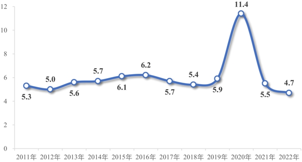 我國產(chǎn)業(yè)用紡織品行業(yè)規(guī)模以上企業(yè)營業(yè)利潤率情況(單位:%)