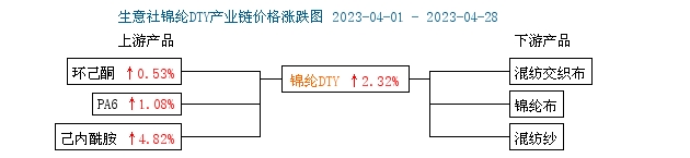 2023年4月,錦綸長絲上游原料己內(nèi)酰胺價格攀升,但下游需求端弱勢難改,錦綸長絲價格漲幅受抑。供應(yīng)端來看,錦綸行業(yè)開工維持穩(wěn)定,貨源供應(yīng)量充足,;從下游來看,下游及終端領(lǐng)域需求跟進(jìn)良好,但整體市場仍處于供大于求狀態(tài),下游需求仍觀望心態(tài)居多,雖然已經(jīng)進(jìn)入傳統(tǒng)旺季,但需求仍不如預(yù)期,按需跟進(jìn)為主。