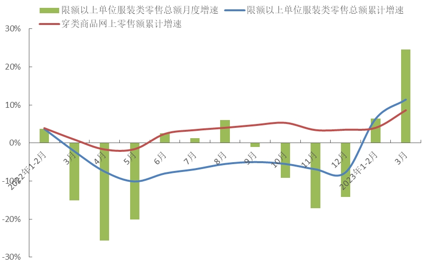 2023年1季度,隨著促消費(fèi)政策措施進(jìn)一步顯效,疊加疫情影響消退等因素,我國(guó)服裝內(nèi)銷市場(chǎng)實(shí)現(xiàn)由降轉(zhuǎn)增的變化,市場(chǎng)活力持續(xù)回升,消費(fèi)需求逐漸釋放。據(jù)國(guó)家統(tǒng)計(jì)局?jǐn)?shù)據(jù),1-3月我國(guó)限額以上單位服裝商品零售額累計(jì)2731.9億元,同比增長(zhǎng)11.4%,增速比2022年全年提升19.1個(gè)百分點(diǎn)。其中3月當(dāng)月實(shí)現(xiàn)兩位數(shù)高速增長(zhǎng),同比增幅達(dá)24.5%,增速比1-2月加快18.1個(gè)百分點(diǎn)。線上零售明顯提速,1-3月穿類商品網(wǎng)上零售額累計(jì)同比增長(zhǎng)8.6%,增速比2022年全年加快5.1個(gè)百分點(diǎn),比1-2月加快4.6個(gè)百分點(diǎn),穿類商品網(wǎng)上零售增速明顯快于吃類和用類商品,吃類和用類商品的網(wǎng)上零售額增速分別為7.3%和6.9%。