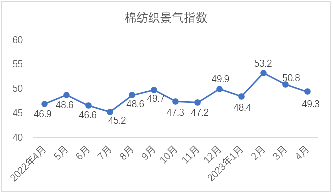 4月,企業(yè)信心指數(shù)為48.6,較3月下降0.1,位于榮枯線下方。當(dāng)前,全球經(jīng)濟(jì)面臨的風(fēng)險(xiǎn)有增無減,外部壓力持續(xù)增加,紡織外貿(mào)市場(chǎng)恢復(fù)仍需時(shí)日。國(guó)內(nèi)經(jīng)濟(jì)處于恢復(fù)階段,內(nèi)需市場(chǎng)發(fā)展空間雖大,但競(jìng)爭(zhēng)較為激烈。臨近傳統(tǒng)紡織淡季,棉紡織企業(yè)對(duì)于后市發(fā)展謹(jǐn)慎觀望,整體信心略顯不足。