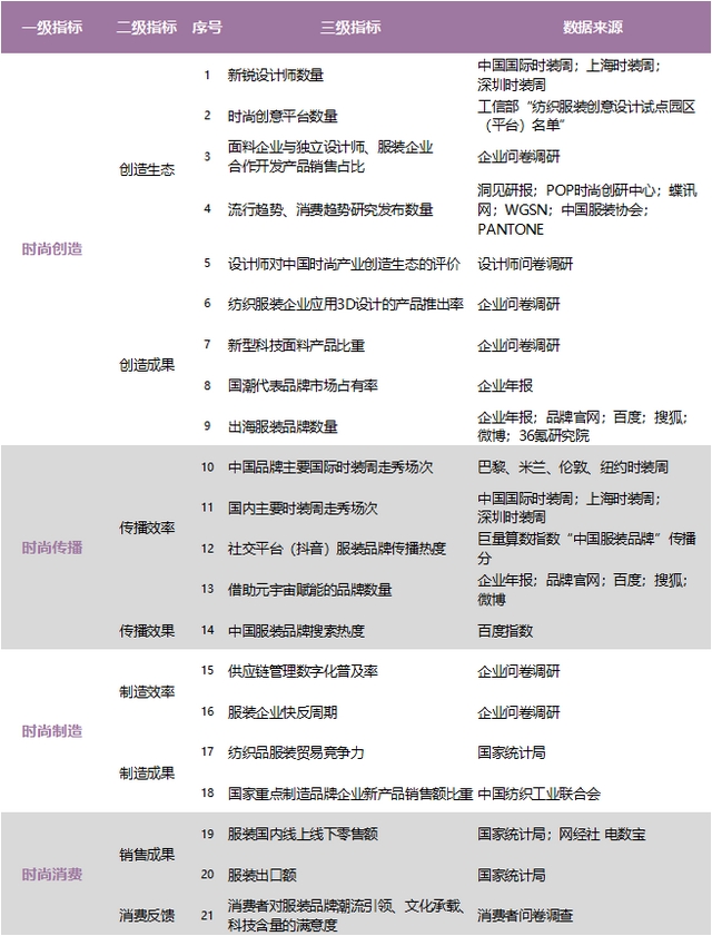 結(jié)合時(shí)尚的新定義、紡織服裝產(chǎn)業(yè)的特征以及產(chǎn)業(yè)鏈關(guān)鍵環(huán)節(jié)綜合考慮,最終形成由4個(gè)一級(jí)指標(biāo)、8個(gè)二級(jí)指標(biāo)、21個(gè)三級(jí)指標(biāo)構(gòu)成的中國(guó)時(shí)尚指數(shù)(產(chǎn)業(yè))評(píng)估體系。