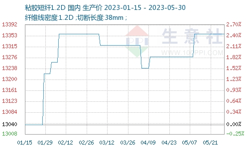 據(jù)生意社商品行情分析系統(tǒng)顯示,5月粘膠短纖價格重心微微上移,截止5月30日,1.2D*38mm粘膠短纖國內(nèi)地區(qū)出廠報價為13360元/噸,較月初上漲80元/噸,月漲幅0.60%。