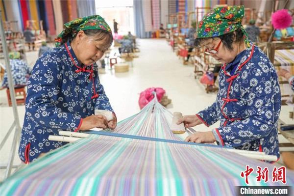 黃河岸邊的農(nóng)家女們化身“織女”,一只只梭子在千百根彩線間來回穿梭