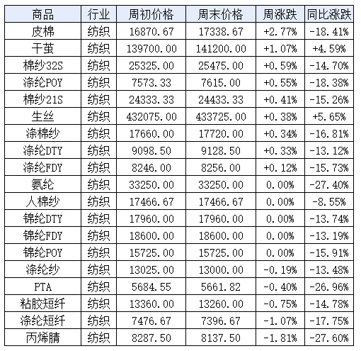 2023年第23周(6.5-6.9)紡織大宗商品價格漲跌榜