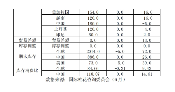國際棉花咨詢委員會(ICAC)2023年6月份發(fā)布的數(shù)據(jù)顯示,2022/23年度,全球棉花期初庫存1942萬噸,環(huán)比持平,同比減少77萬噸;產(chǎn)量2451萬噸,環(huán)比減少4萬噸,同比減少67萬噸;消費2379萬噸,環(huán)比持平,同比減少202萬噸;期末庫存2014萬噸,環(huán)比減少5萬噸,同比增加72萬噸;期末庫存消費比84.66%,環(huán)比下降0.21個百分點,同比上升9.42個百分點(詳見附件1)。