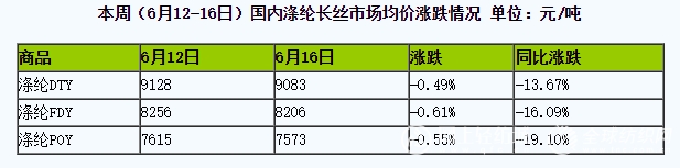 據(jù)生意社商品行情分析系統(tǒng),本周(6月12-16日)國(guó)內(nèi)滌綸長(zhǎng)絲價(jià)格小幅下跌,截止6月16日江浙地區(qū)主流滌綸長(zhǎng)絲工廠,滌綸POY(150D/48F)報(bào)價(jià)在7500-7800元/噸,滌綸DTY(150D/48F低彈)報(bào)價(jià)在8850-9350元/噸,滌綸FDY(150D/96F)報(bào)價(jià)在8050-8350元/噸。