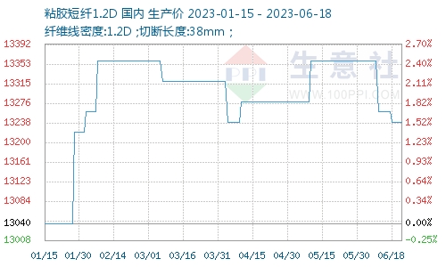 據(jù)生意社商品行情分析系統(tǒng)顯示,上周(2023年6月12—18日),粘膠短纖價(jià)格重心微微下調(diào),截止6月18日,1.2D*38mm粘膠短纖國內(nèi)地區(qū)出廠報(bào)價(jià)為13240元/噸,較上周期價(jià)格下跌20元/噸。