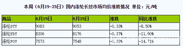 據(jù)生意社商品行情分析系統(tǒng),本周(6月19日-25日)國內(nèi)滌綸長絲價格維持小幅下跌,截止6月25日江浙地區(qū)主流滌綸長絲工廠,滌綸POY(150D/48F)報價在7450-7800元/噸,滌綸DTY(150D/48F低彈)報價在8800-9350元/噸,滌綸FDY(150D/96F)報價在8000-8250元/噸。