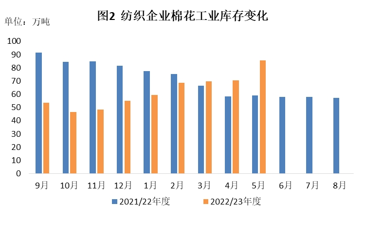 5月以來(lái)紡織廠短期訂單仍充足,開(kāi)機(jī)率基本保持穩(wěn)定,月內(nèi)棉價(jià)走勢(shì)較強(qiáng),企業(yè)多逢低適量補(bǔ)庫(kù),總體原料庫(kù)存有所增加。截至5月31日,紡織廠在庫(kù)棉花工業(yè)庫(kù)存量為85.44萬(wàn)噸,較上月底增加14.88萬(wàn)噸,同比增加26.43萬(wàn)噸。其中:28%企業(yè)減少棉花庫(kù)存,37%增加庫(kù)存,35%基本保持不變。