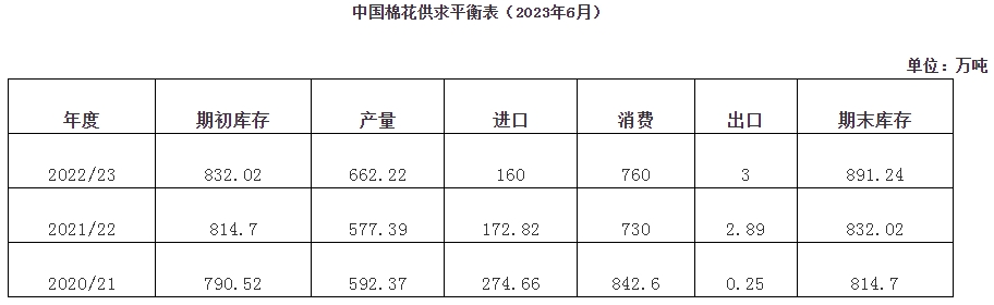 5月,國內經(jīng)濟運行總體延續(xù)恢復態(tài)勢,內需緩慢復蘇,外貿市場承壓運行。國內棉價受棉花減產(chǎn)預期影響,棉價快速上漲,24日中國棉花價格指數(shù)(CCIndex3128B)上漲至16658元/噸,創(chuàng)年度新高;國際棉價波動回落,內外棉價差有所擴大。當月國內棉花供應寬松,紡織生產(chǎn)平穩(wěn)運行,企業(yè)按需采購原料。中國棉花協(xié)會預計,2022年度全國棉花產(chǎn)量為662.2萬噸,同比增長14.7%;進口量為160萬噸,同比下降7.4%;棉花消費量、出口量分別為760萬噸和3萬噸;期末庫存為891.2萬噸,同比增長7.1%。