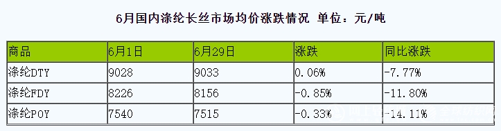 據(jù)生意社商品行情分析系統(tǒng),6月國內(nèi)滌綸長絲價格先漲后跌,截止6月29日江浙地區(qū)主流滌綸長絲工廠,滌綸POY(150D/48F)報價在7350-7550元/噸,滌綸DTY(150D/48F低彈)報價在8700-9250元/噸,滌綸FDY(150D/96F)報價在8000-8250元/噸。受成本利好提振,助推滌絲價格,但隨著淡季現(xiàn)象加深,需求不足之下行情震蕩走弱。