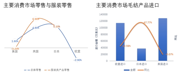 (注:美國、英國零售市場數(shù)據(jù)為5月數(shù)據(jù)、歐盟、日本零售市場為4月數(shù)據(jù);美國、日本毛紡進口數(shù)據(jù)為1~5月數(shù)據(jù),歐盟毛紡進口數(shù)據(jù)為1~3月數(shù)據(jù))