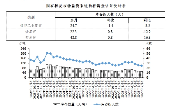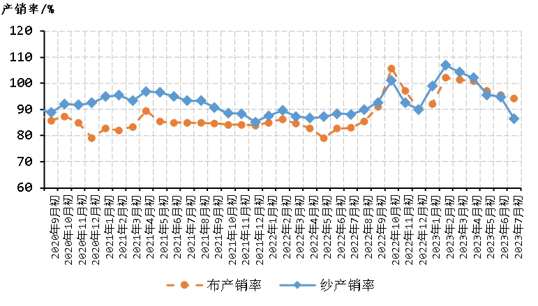 2023年7月初,被抽樣調(diào)查企業(yè)紗產(chǎn)銷(xiāo)率為86.4%,環(huán)比下降8.4個(gè)百分點(diǎn),同比下降1.7個(gè)百分點(diǎn),比近五年同期平均水平下降7.4個(gè)百分點(diǎn);庫(kù)存為22.3天銷(xiāo)售量,環(huán)比增加0.8天,同比減少12.9天,比近五年同期平均水平增加0.7天(如圖7、圖8)。布的產(chǎn)銷(xiāo)率為94.2%,環(huán)比下降1.4個(gè)百分點(diǎn),同比提高11.2個(gè)百分點(diǎn),比近五年同期平均水平提高3.1個(gè)百分點(diǎn);庫(kù)存為42.8天銷(xiāo)售量,環(huán)比增加0.8天,同比減少16.8天,比近五年同期平均水平減少2.1天(如圖7、圖9)。