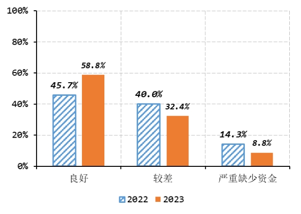 資金周轉(zhuǎn)調(diào)查顯示,2023年7月初,資金周轉(zhuǎn)良好的企業(yè)占58.8%,環(huán)比增加1.9個(gè)百分點(diǎn),同比增加13.1個(gè)百分點(diǎn),比近五年同期平均水平減少0.7個(gè)百分點(diǎn);資金周轉(zhuǎn)較差的占32.4%,環(huán)比減少2.4個(gè)百分點(diǎn),同比減少7.6個(gè)百分點(diǎn),比近五年同期平均水平增加1.8個(gè)百分點(diǎn);嚴(yán)重缺少資金的占8.8%,環(huán)比增加0.5個(gè)百分點(diǎn),同比減少5.5個(gè)百分點(diǎn),比近五年同期平均水平減少1.1個(gè)百分點(diǎn)(如圖5)。