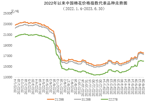 6月份,中國(guó)棉花價(jià)格指數(shù)持續(xù)上漲,最高至17540元/噸,創(chuàng)本年度以來(lái)新高。月上旬國(guó)內(nèi)宏觀氛圍轉(zhuǎn)暖以及市場(chǎng)預(yù)期棉花供應(yīng)偏緊,國(guó)內(nèi)期現(xiàn)貨市場(chǎng)價(jià)格持續(xù)上漲,月中下旬下游紡織需求轉(zhuǎn)弱,支撐力度有限,棉價(jià)向下傳導(dǎo)不利,國(guó)內(nèi)棉花現(xiàn)貨價(jià)格承壓下行。月內(nèi)棉花企業(yè)銷售積極性較好,但正值紡織淡季,下游需求持續(xù)轉(zhuǎn)弱,補(bǔ)庫(kù)意愿逐漸轉(zhuǎn)弱,多剛需采購(gòu)為主。月末,中國(guó)棉花價(jià)格指數(shù)(CCIndex3128B)為17304元/噸,環(huán)比上漲896元;月均價(jià)為17280元/噸,環(huán)比上漲915元,同比下跌2959元。