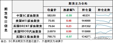 【1】WTI主力原油期貨收漲0.36美元,漲幅0.48%,報(bào)75.65美元/桶;布倫特主力原油期貨收漲0.18美元,漲幅0.23%,報(bào)79.64美元/桶;INE原油期貨收跌0.99%,報(bào)582.8元。