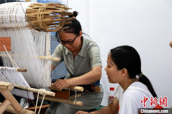 在培訓(xùn)班里,蒙麗再展示了毛南錦的傳統(tǒng)織造技藝,并向?qū)W員們介紹毛南錦的歷史、文化價(jià)值和制作過(guò)程,分享自己在傳承與發(fā)展毛南錦編織技藝過(guò)程中的心得體會(huì)。蒙麗再在學(xué)員身邊一一指導(dǎo)講解,并一步一步進(jìn)行步驟示范。飛梭走線,一根根色彩鮮艷的棉線、絲線,在織機(jī)上不停地穿梭,一會(huì)兒推一會(huì)兒拉,圖案的雛形逐漸在織機(jī)上顯現(xiàn)。