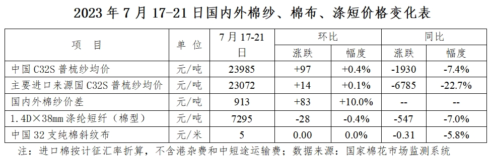 本周(2023年7月17-21日),國內(nèi)外棉花價格上漲;國內(nèi)棉紗價格上漲,外紗價格小幅反彈;國內(nèi)滌綸短纖價格繼續(xù)回落。