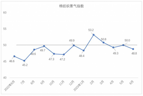 6月,中國棉紡織景氣指數(shù)為48.8,較5月下降1.2,位于榮枯線下方,行業(yè)景氣水平回落。從分項(xiàng)指數(shù)看,構(gòu)成中國棉紡織景氣指數(shù)的7個(gè)分項(xiàng)指數(shù)中,原料采購指數(shù)、原料庫存指數(shù)、生產(chǎn)指數(shù)、產(chǎn)品銷售指數(shù)、產(chǎn)品庫存指數(shù)、企業(yè)經(jīng)營指數(shù)、企業(yè)信心指數(shù)均較5月下降,其中企業(yè)信心指數(shù)下降幅度較大。