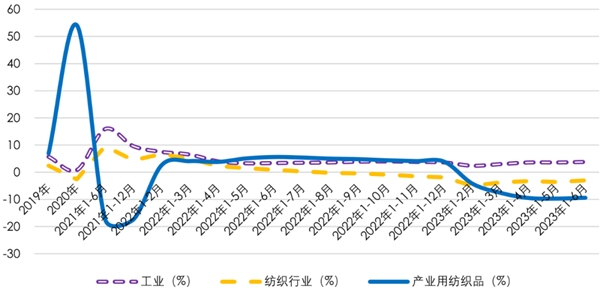 2020年疫情發(fā)生以來(lái),我國(guó)產(chǎn)業(yè)用紡織品行業(yè)工業(yè)增加值出現(xiàn)大幅度振蕩。2020年行業(yè)工業(yè)增加值增速達(dá)到歷史高點(diǎn),2021年迅速回落,2022年后開(kāi)始恢復(fù)增長(zhǎng),2022年上半年達(dá)到全年最高點(diǎn),此后增速開(kāi)始放緩,2023年以來(lái)再度進(jìn)入下降區(qū)間(圖1)。