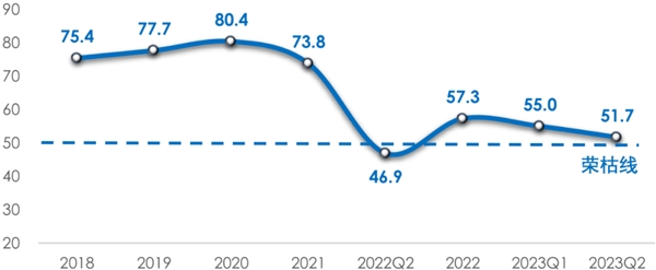 根據(jù)協(xié)會(huì)對(duì)樣本企業(yè)的調(diào)研,2023年上半年產(chǎn)業(yè)用紡織品行業(yè)的景氣指數(shù)為51.7,處于微景氣區(qū)間,較2023年一季度下降3.3,較2022年同期上升4.8,遠(yuǎn)低于2021年前的指標(biāo)(圖2)。