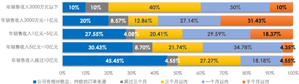 企業(yè)在手訂單方面,32.2%的受訪企業(yè)擁有相對(duì)穩(wěn)定、持續(xù)的訂單來(lái)源或在手訂單能夠支持三個(gè)月以上的生產(chǎn),而28.3%的受訪企業(yè)在手訂單僅能夠支撐企業(yè)一個(gè)月以內(nèi)的生產(chǎn)。根據(jù)企業(yè)規(guī)模,大企業(yè)的在手訂單更加穩(wěn)定、充足,能夠支持更長(zhǎng)時(shí)間的生產(chǎn);而中小企業(yè)的在手訂單大多只能夠支撐一個(gè)月以內(nèi)甚至半個(gè)月以內(nèi)的生產(chǎn)(圖4)。