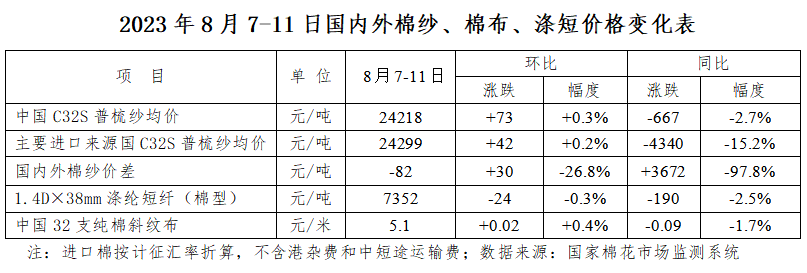 本周(2023年8月7-11日),國(guó)內(nèi)棉花價(jià)格穩(wěn)中有降,國(guó)際棉花價(jià)格震蕩上漲;國(guó)內(nèi)外棉紗價(jià)格繼續(xù)回升;滌綸短纖價(jià)格由漲轉(zhuǎn)跌。