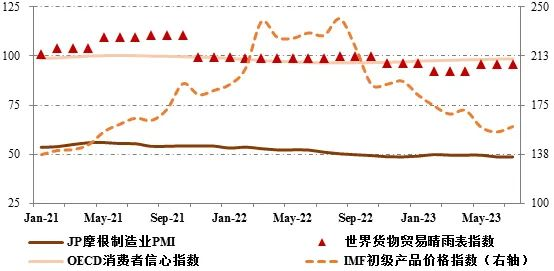 2023年上半年,全球經(jīng)濟(jì)在服務(wù)業(yè)穩(wěn)定復(fù)蘇、國(guó)際供應(yīng)鏈恢復(fù)通暢以及通貨膨脹水平逐步回落支撐下維持低速增長(zhǎng),但主要經(jīng)濟(jì)體央行持續(xù)加息對(duì)經(jīng)濟(jì)復(fù)蘇的負(fù)面影響持續(xù)顯現(xiàn),消費(fèi)端復(fù)蘇依舊乏力,制造業(yè)及商品貿(mào)易景氣低迷。全球制造業(yè)景氣指數(shù)連續(xù)11個(gè)月處于收縮區(qū)間,7月J.P. Morgan制造業(yè)采購(gòu)經(jīng)理指數(shù)(PMI)為48.7,其中新出口訂單指數(shù)僅為46.3,均降至今年以來(lái)新低;美國(guó)、德國(guó)、日本制造業(yè)PMI全部處于緊縮區(qū)間。經(jīng)合組織(OECD)消費(fèi)者信心指數(shù)回升至98.5,但仍連續(xù)第24個(gè)月低于榮枯線。世界貿(mào)易組織(WTO)5月發(fā)布的全球貨物貿(mào)易晴雨表指數(shù)為95.6,低于100趨勢(shì)水平。國(guó)際大宗商品價(jià)格持續(xù)回落,7月國(guó)際貨幣基金組織(IMF)初級(jí)產(chǎn)品價(jià)格指數(shù)為158.7,較上年同期大幅下降69.7個(gè)百分點(diǎn)。