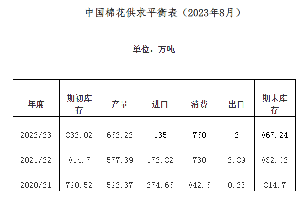 7月,全國大部棉花處于開花期,整體長勢好于預(yù)期。國內(nèi)棉價(jià)維持偏強(qiáng)走勢,24日中國棉花價(jià)格指數(shù)上漲至18070元/噸,創(chuàng)本年度以來新高。之后,滑準(zhǔn)稅配額和儲(chǔ)備棉銷售政策先后公布,疊加需求端偏弱,月末棉價(jià)出現(xiàn)回調(diào)。同期,國際棉價(jià)也明顯上漲,但是因經(jīng)濟(jì)衰退預(yù)期較強(qiáng),漲幅不及國內(nèi)。紡織品市場仍處傳統(tǒng)淡季,棉花價(jià)格上漲向后道傳導(dǎo)不暢,紗線銷售依然冷清,成品庫存持續(xù)增加。中國棉花協(xié)會(huì)統(tǒng)計(jì),2022年度全國棉花產(chǎn)量為662.2萬噸,同比增長14.7%;預(yù)測棉花消費(fèi)量為760萬噸;進(jìn)口量根據(jù)海關(guān)總署數(shù)據(jù)由160萬噸下調(diào)至135萬噸,同比下降22%;出口量下調(diào)至2萬噸;期末庫存相應(yīng)下調(diào)為867.2萬噸,同比增長4.2%。