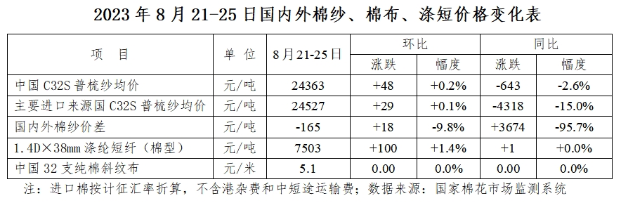本周(2023年8月21-25日),國內(nèi)外棉花價(jià)格反彈;國內(nèi)外棉紗價(jià)格繼續(xù)小幅回升;滌綸短纖價(jià)格上漲。