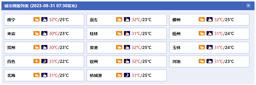 預(yù)計(jì)今天(8月31日)白天到晚上,廣西天氣繼續(xù)唱“晴”歌。晴朗維持,氣溫逐漸回升,午后全區(qū)大部最高氣溫都將升回30℃。而北風(fēng)控制下,體感不會(huì)那么黏糊難受。