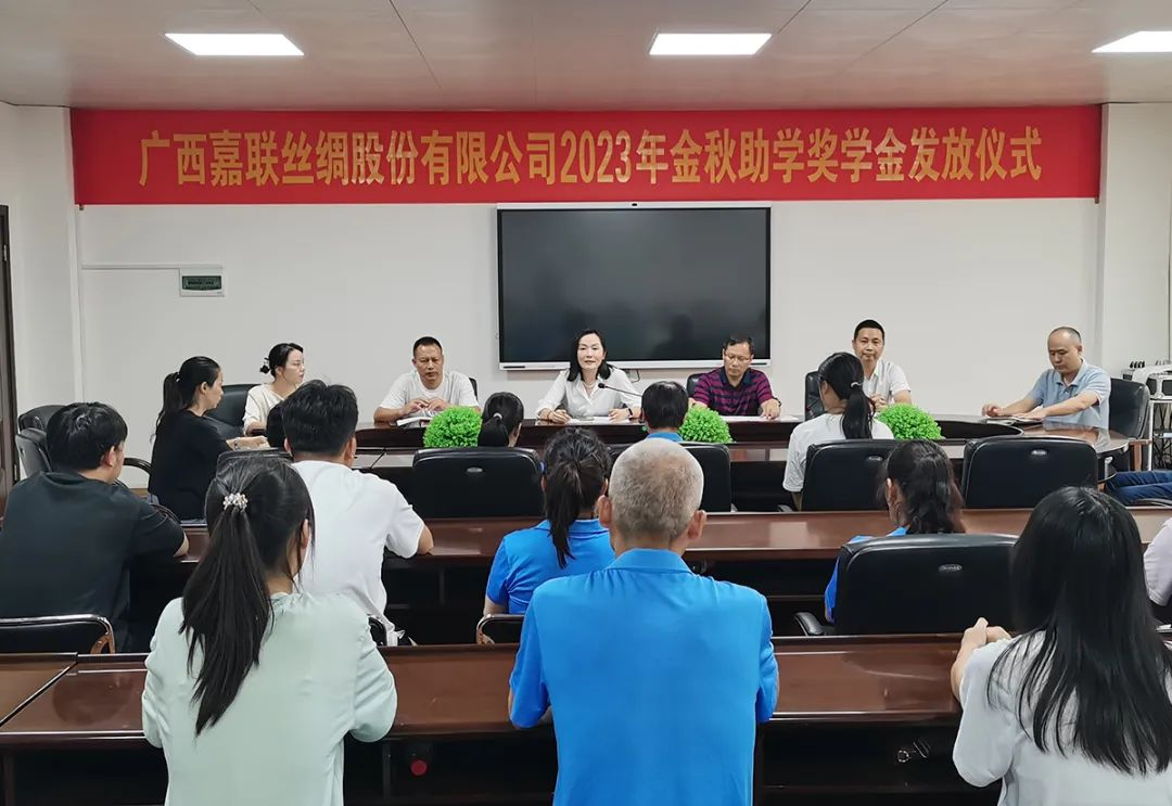 2023年8月30日,廣西嘉聯(lián)絲綢股份有限公司在四樓會(huì)議室舉行2023年金秋助學(xué)獎(jiǎng)學(xué)金發(fā)放儀式,今年共有12名嘉聯(lián)員工子女被高等院校錄取獲得公司獎(jiǎng)學(xué)金資助。