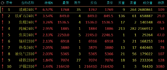 午盤收盤,國(guó)內(nèi)期貨主力合約多數(shù)上漲,玻璃(1789, 25.00, 1.42%)漲超6%,鐵礦(846, 4.50, 0.53%)、焦煤(1593, 64.50, 4.22%)漲超3%,純堿漲近3%,錳硅(6946, 52.00, 0.75%)、液化石油氣(LPG)、熱卷(3903, 47.00, 1.22%)、焦炭(2297, 60.50, 2.71%)漲超2%。跌幅方面,蘋果(8807, -42.00, -0.47%)跌近2%,集運(yùn)指數(shù)(歐線)跌超1%。