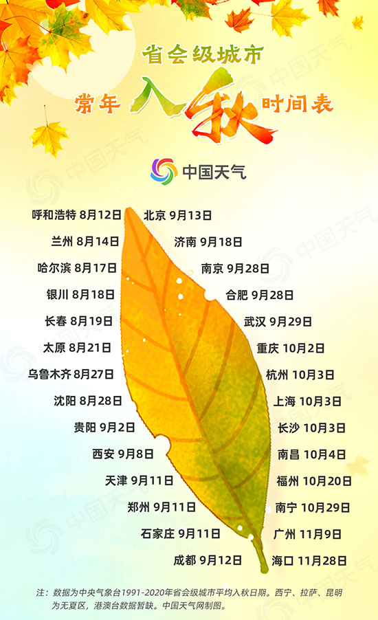 中國(guó)天氣網(wǎng)統(tǒng)計(jì)了1991至2020年省會(huì)級(jí)城市的入秋日期發(fā)現(xiàn),9月至10月是全國(guó)入秋最集中的時(shí)間,北京、上海、成都、長(zhǎng)沙、武漢、杭州等18個(gè)省會(huì)級(jí)城市會(huì)陸續(xù)開(kāi)啟入秋進(jìn)程。