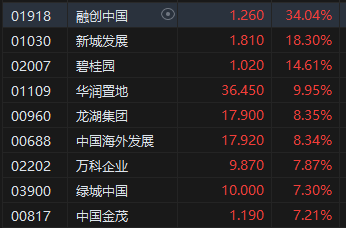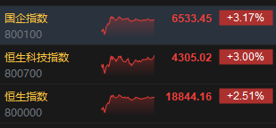 9月4日消息,今日港股三大指數(shù)高開高走,截至收盤,恒生指數(shù)(18844.16, 462.10, 2.51%)漲2.51%,報(bào)18844.16點(diǎn),恒生科技指數(shù)(4305.02, 125.53, 3.00%)漲3%,國(guó)企指數(shù)漲3.17%。盤面上,科網(wǎng)股普遍上漲,京東漲近5%,百度、阿里、美團(tuán)漲超3%;造車新勢(shì)力齊漲,零跑漲近7%領(lǐng)銜;旅游股漲幅居前,中國(guó)中免(114.9, 9.60, 9.12%)漲超9%,香港中旅(1.61, 0.12, 8.05%)漲超8%;內(nèi)房股集體強(qiáng)勢(shì),帶領(lǐng)物管股、建材水泥股齊漲,融創(chuàng)中國(guó)(1.26, 0.32, 34.04%)漲超34%領(lǐng)銜;半導(dǎo)體概念股漲幅居前,中芯國(guó)際(21.85, 2.15, 10.91%)尾盤拉升收漲近11%;有色金屬板塊漲幅活躍,中國(guó)鋁業(yè)(4.33, 0.54, 14.25%)漲超14%;銀行股、內(nèi)險(xiǎn)股、石油股表現(xiàn)強(qiáng)勁。