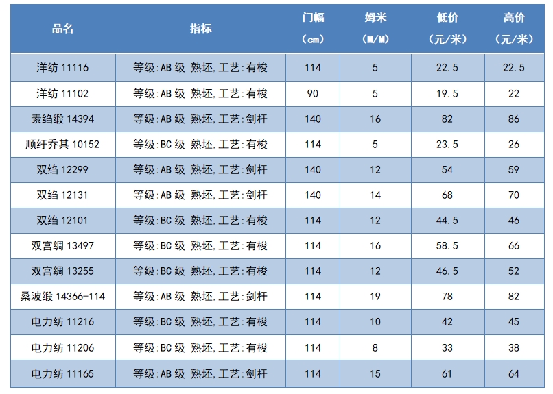 本周綢緞指數(shù)協(xié)作單位成交價格區(qū)間