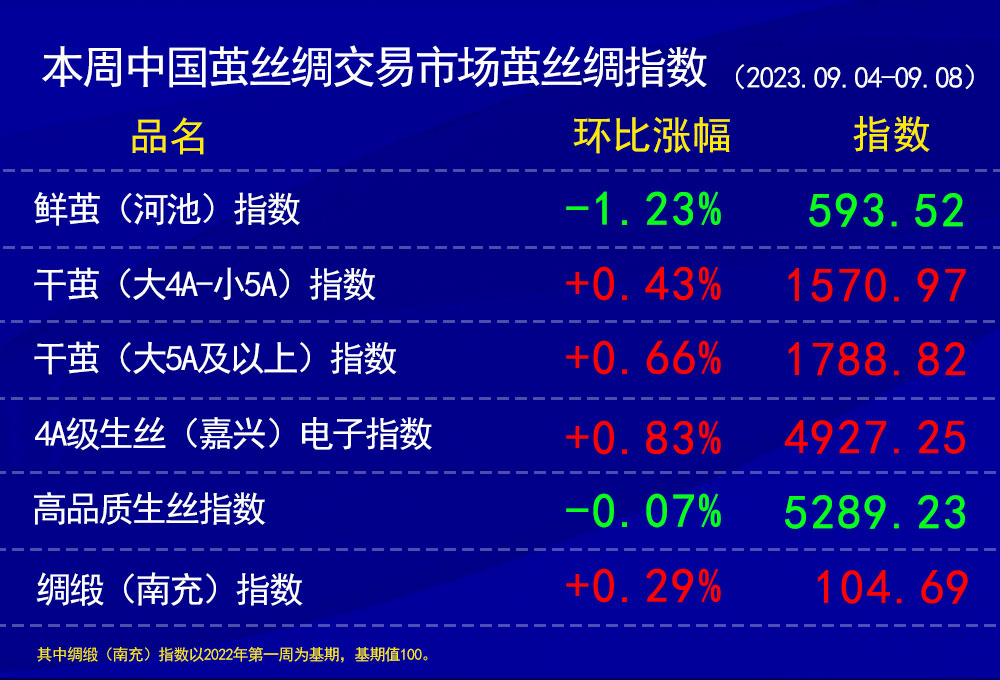 高品質(zhì)生絲價格指數(shù)方面,根據(jù)協(xié)作單位所報,整體價格環(huán)比上周相差不大,同時,走貨量上繼續(xù)上周節(jié)奏特點,較前期有所放緩。